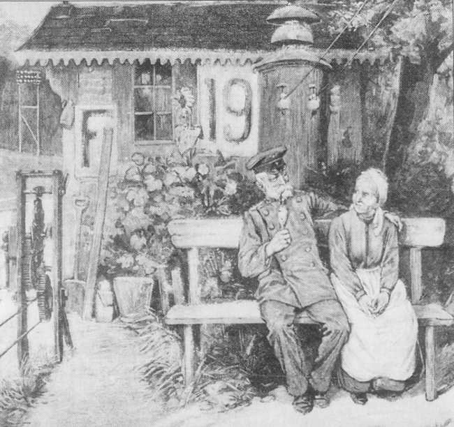 Für die Bahnwärter an ihrem Posten wurden in vielen Fällen nur Unterstände gebaut. Abbildungen aus dem 19. Jahrhundert zeigen Schildhäuschen, wie sie vor allem im militärischen Bereich in Gebrauch waren [ 6 ]. Befand sich der Bahnwärterposten in größerer Entfernung von der nächsten Siedlung - bei der Main-Neckar-Bahn beispielsweise lag die Grenze bei 1/4 Wegstunde [ 7 ] - so wurde ein Haus für den Bahnwärter und seine Familie errichtet. Auf die Lebensverhältnisse der Schrankenwärter wird im Abschnitt Menschliches näher eingegangen.