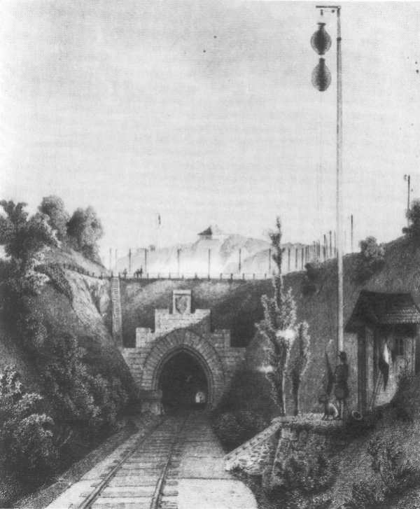 | Einen typischen Bahnwärterposten aus der Anfangszeit der Eisenbahn zeigt dieser Stich des Nürnberger Künstlers Rohbock aus dem Jahr 1850: Ein Korbsignal dient der Weitergabe von Zugmeldungen und ein Schildhaus schützt den Wärter vor Regen und Sonne. Mit der Bewachung des Tunnels kommt dem Bahnwärter eine ganz besondere Verantwortung zu. Aus: Kubinsky 1990 |