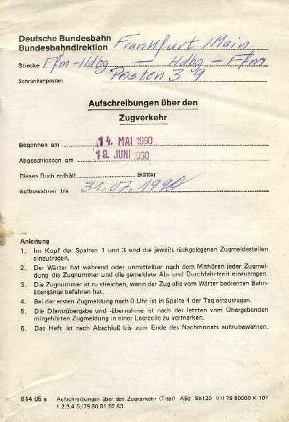 | Titelblatt der 'Aufschreibungen über den Zugverkehr' an Posten 39 bei Bickenbach. |