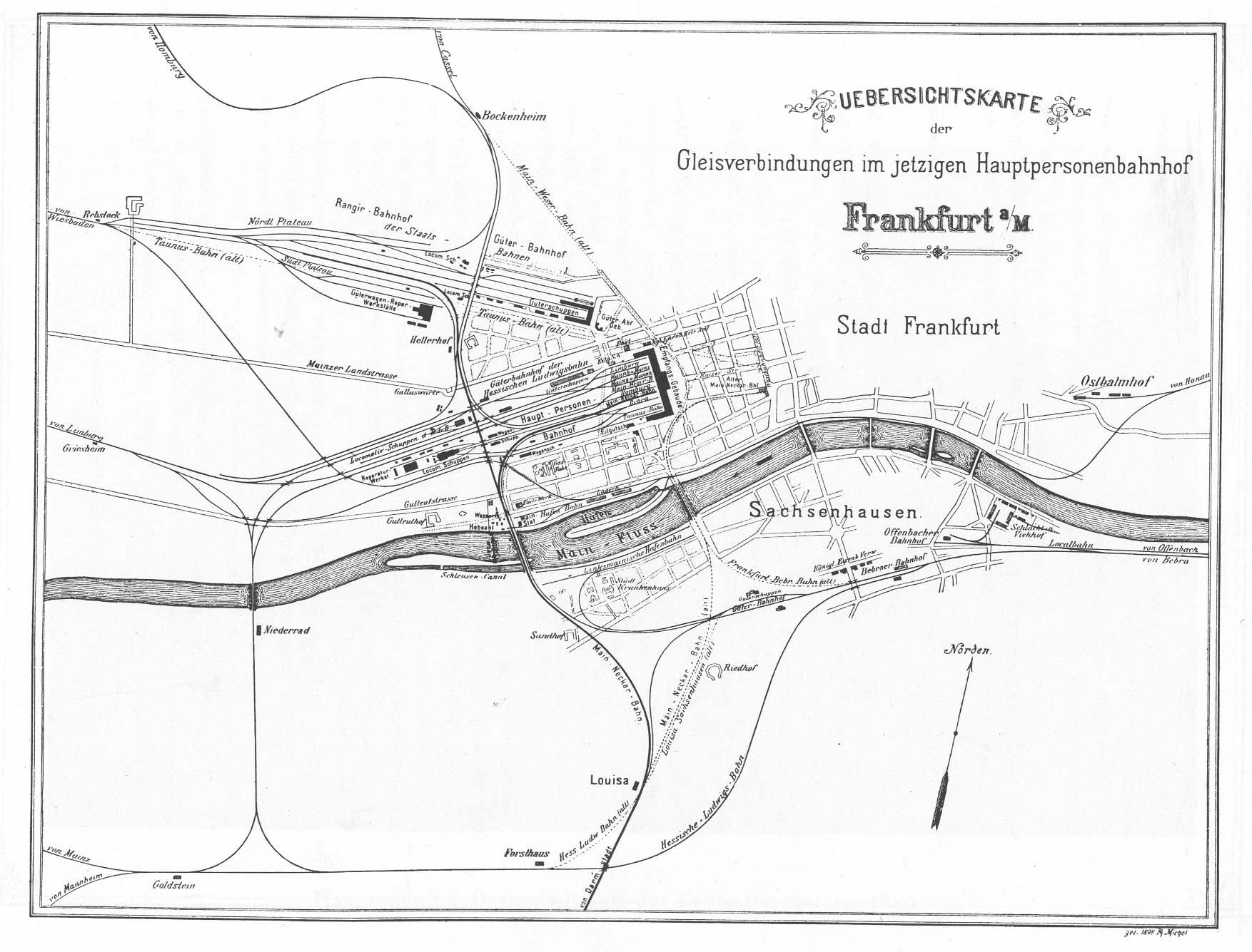 Im folgenden Jahrzehnt werden Strecken und Bahnhöfe in Frankfurt mit Bau des Hauptgüterbahnhofs und des Hauptbahnhofs grundlegend neu geordnet. In diesem Zusammenhang wird die Verbindung Forsthaus - Louisa stillgelegt. Köhler, Günter H.; Christopher, Andreas: Eisenbahnen im Rhein-Main-Gebiet. Freiburg 1983 vermuten als Stillegungsjahr 1882; dies würde aber bedeuten, dass alle Züge der Mainbahn und der Riedbahn nur noch nach Sachsenhausen oder nach Griesheim (Verbindung Goldstein - Niederrad - Griesheim 1882 eröffnet) hätten geführt werden können, was nicht so recht plausibel erscheint. Als Stillegungsdatum kommt wohl eher 1888 in Frage, als für die Mainbahn- und Riedbahnzüge die Führung via Niederräder Brücke in den neuen Hauptbahnhof möglich wurde.