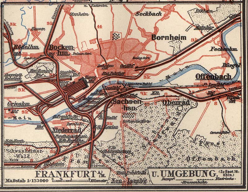 Ebenfalls 1882 soll die Verbindung Forsthaus - Niederrad erstmals und kurzzeitig in Betrieb gegangen sein, so zumindest die Angabe bei Köhler/Christopher. Auch in der obigen Karte von 1896 ist diese Kurve eingezeichnet, während sie in der nachfolgenden Skizze aus gleicher Quelle und gleichem Jahr fehlt: