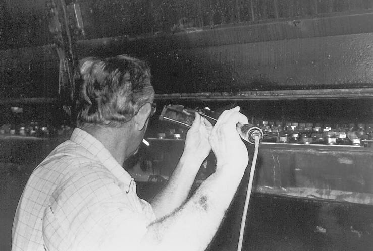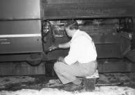 Viel Sorgfalt wurde auch auf die kleinen Unterhaltungsarbeiten verwandt, so etwa auf das Schmieren aller beweglichen Verbindungen am Wagen. Bernhard Becker macht sich mit seinem Ölkännchen gerade an der Halterung des Steuerkabels von 515 022 zu schaffen, der erst wenige Tage zuvor aus Augsburg ins schöne Rheinhessen gekommen war.