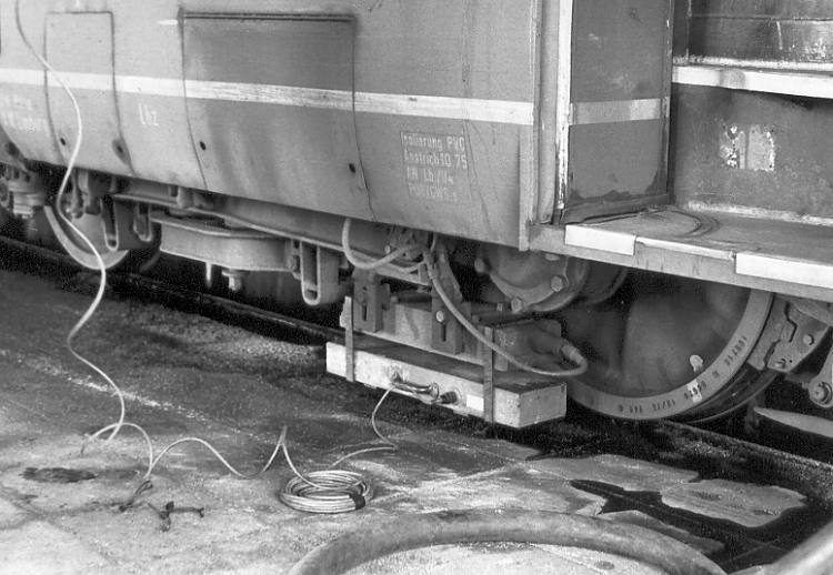 Bei Störungen und bei größeren Fristarbeiten war eine Überprüfung der INDUSI-Anlage erforderlich. Hier der Prüfmagnet außen an 515 526, ...