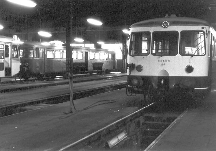 Zum Abschluss noch ein Blick in die Halle dem Steuerwagen 815 611 im Vordergrund und dem bereits gezeigten 515 002 im Hintergrund. Am linken Rand streckt schon ein nagelneuer 628 seine Nase ins Bild, Bote des baldigen Endes der ETA im Bw Worms.