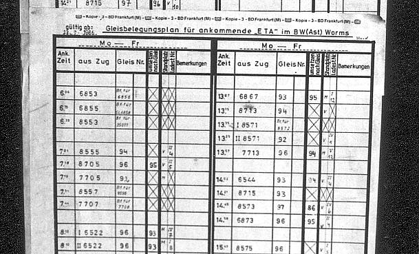 Die laufende Unterhaltung wollte geplant sein: Belegungsplan für die sechs Hallengleise und die Ladestände des Bw Worms. Die Tatsache, dass bereits um 7 Uhr die ersten ETA wieder ins Bw einrückten, zeigt, dass die Fahrzeuge häufig nur für einzelne Leistungen gebraucht wurden und nur noch geringe Kilometerleistungen erbrachten. Der in der rechten Spalte aufgeführte 6544 war übrigens die einzige Leistung, mit der Mannheim erreicht wurde; er fuhr zudem passend zum Ende meines Frühdienstes im Zivildienst, so dass er ein beliebtes Fotoobjekt abgab.