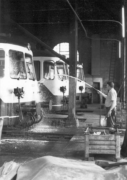 Das Besondere an der Unterhaltung von Akkutriebwagen war die aufwändige und diffizile Wartung der Batterien. Diese wurde von jeher nicht von der Bahn (KPEV, DRG, DB) selbst vorgenommen, sondern von der Herstellerfirma VARTA, die eigens dafür im Bw Worms drei Mann Personal vorhielt. Im Bild bessert VARTA-Mitarbeiter Erich Allebrand gerade den Isolieranstrich im Batteriekasten eines 515.5 aus. Neuanstriche waren regelmäßig erforderlich und sorgfältig auszuführen, um Korrosion des Wagenkastens durch die Säuredämpfe der Batterien zu verhindern.