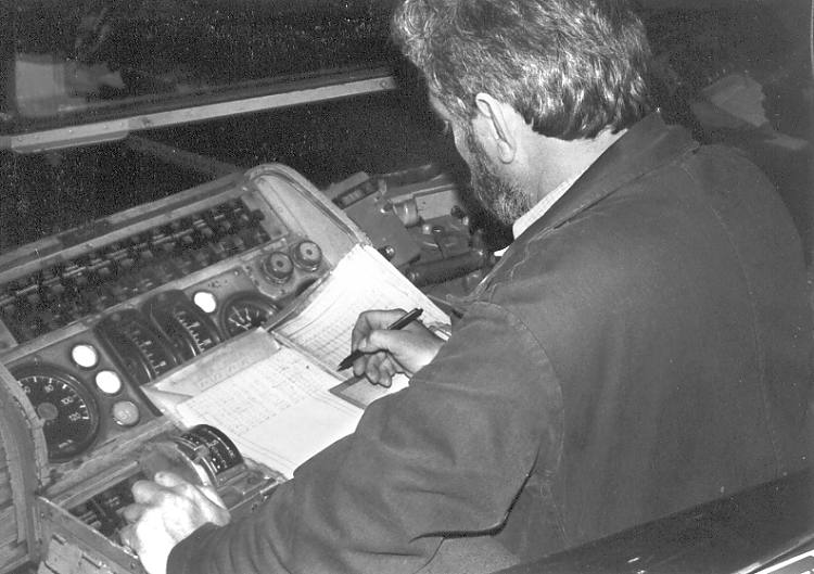 ... Bw-Elektriker Siegfried Schiemer beim Notieren der Messwerte am am Fahrpult des ETA.